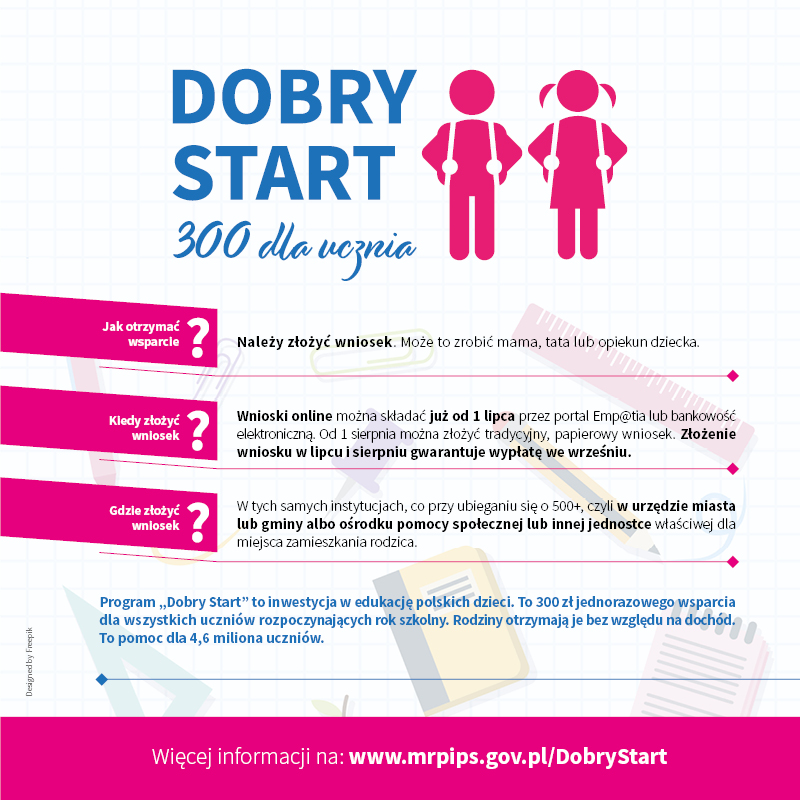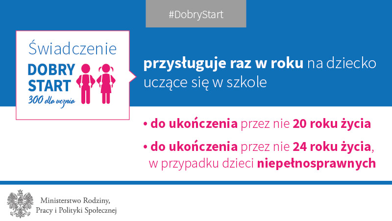 W związku z wejściem w życie z dniem 1 czerwca 2018r. rozporządzenia Rady Ministrów z dnia 30 maja 2018r. w sprawie szczegółowych warunków realizacji rządowego programu "Dobry start" (Dz. U. poz. 1061) wnioski o świadczenie z Programu Rządowego "Dobry start" będzie można składać drogą elektroniczną poprzez bankowość elektroniczną i min